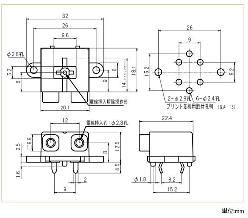 端子間ピッチ9mm&電源用スクリューレス単銅線専用です。材質/色・主絶縁材 (本体) PBT (UL94V-0)/GY (グレー)・主絶縁材 (ボタン) PBT (UL94V-0)/B (黒)仕様・定格 250V-20A・絶縁抵抗 DC500V、1000MΩ以上 ・耐電圧 AC2000V (1分間)・取得規格 UL規格 (フィールドワイヤリング対応)CSA規格・TÜV規格 (IEC60947-7-1に適合)・極数 (P) 2・定格適合電線 単線 : Φ2.0mm (AWG12)・使用可能電線範囲 単線 : Φ1.6mm~Φ2.0mm (AWG16~AWG12)・端子金具 PC端子・標準剥き線長 14mm・推奨適合工具 マイナスドライバー (軸径Φ6mm、刃先幅6mm)プラスドライバー (軸径Φ4mm)・取付方式 ねじ止め・取付基板厚 1.6mm商品概要・ボタンの動作を円滑にするため、ボタンにフッ素樹脂を塗布しております。ボタン操作部の凹箇所等にこのフッ素樹脂が集中して滞留することにより白い異物が付着した様に見えることがありますが、品質には問題ありません。使用上の注意・丸洗い洗浄は製品性能に悪影響が考えられますので、お避けください。・規格品としてご使用の場合は、規格上の制約等をご確認ください。フローはんだ付け条件・予熱温度 100~140℃・予熱時間 40秒・浸漬温度 265±3℃・浸漬時間 10±1秒手はんだ付け(はんだコテ付け)条件・コテ先温度 390±10℃・コテ当て時間 5±1秒・回数 2回※リフローは対象外の製品です。はんだコテによる2回目のはんだ付けは1回目のはんだ付け後、製品が十分に冷え、常温に戻ってから行って下さい。ご使用の際は実使用条件によるご確認をお奨め致します。なお、上記条件は製品単体にて試験を行い確認したものです。※写真はイメージです。※在庫切れの場合は別途御相談させて頂きます。