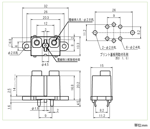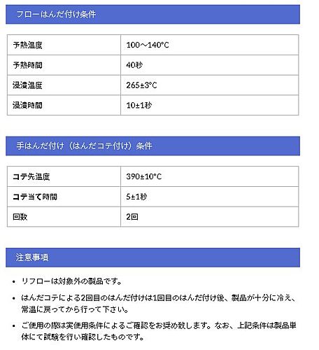 端子間ピッチ9mm&電源用スクリューレス単銅線専用です。材質/色・主絶縁材 (本体) PBT (UL94V-0)/GY (グレー)・主絶縁材 (ボタン) PBT (UL94V-0)/B (黒)仕様・定格 250V-20A・絶縁抵抗 DC500V、1000MΩ以上 ・耐電圧 AC2000V (1分間)・取得規格 UL規格 (フィールドワイヤリング対応)CSA規格・TÜV規格 (IEC60947-7-1に適合)・極数 (P) 2・定格適合電線 単線 : Φ2.0mm (AWG12)・使用可能電線範囲 単線 : Φ1.6mm~Φ2.0mm (AWG16~AWG12)・端子金具 PC端子・標準剥き線長 14mm・推奨適合工具 マイナスドライバー (軸径Φ6mm、刃先幅6mm)プラスドライバー (軸径Φ4mm)・取付方式 ねじ止め・取付基板厚 1.6mm商品概要・ボタンの動作を円滑にするため、ボタンにフッ素樹脂を塗布しております。ボタン操作部の凹箇所等にこのフッ素樹脂が集中して滞留することにより白い異物が付着した様に見えることがありますが、品質には問題ありません。使用上の注意・丸洗い洗浄は製品性能に悪影響が考えられますので、お避けください。・規格品としてご使用の場合は、規格上の制約等をご確認ください。フローはんだ付け条件・予熱温度 100~140℃・予熱時間 40秒・浸漬温度 265±3℃・浸漬時間 10±1秒手はんだ付け(はんだコテ付け)条件・コテ先温度 390±10℃・コテ当て時間 5±1秒・回数 2回※リフローは対象外の製品です。はんだコテによる2回目のはんだ付けは1回目のはんだ付け後、製品が十分に冷え、常温に戻ってから行って下さい。ご使用の際は実使用条件によるご確認をお奨め致します。なお、上記条件は製品単体にて試験を行い確認したものです。※写真はイメージです。※在庫切れの場合は別途御相談させて頂きます。