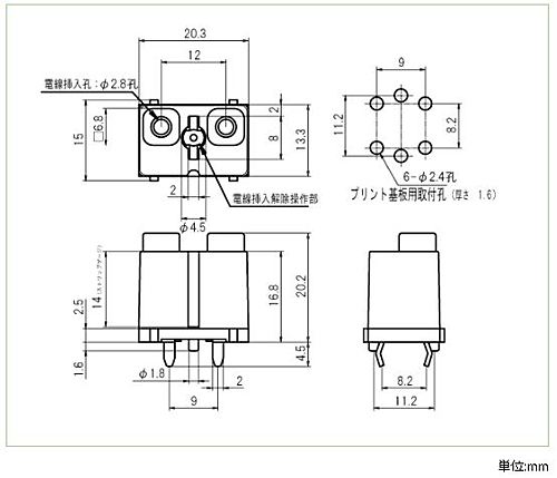 端子間ピッチ9mm&電源用スクリューレス単銅線専用です。材質/色・主絶縁材 (本体) PBT (UL94V-0)/GY (グレー)・主絶縁材 (ボタン) PBT (UL94V-0)/B (黒)仕様・定格 250V-20A・絶縁抵抗 DC500V、1000MΩ以上 ・耐電圧 AC2000V (1分間)・取得規格 UL規格 (フィールドワイヤリング対応)CSA規格・TÜV規格 (IEC60947-7-1に適合)・極数 (P) 2・定格適合電線 単線 : Φ2.0mm (AWG12)・使用可能電線範囲 単線 : Φ1.6mm~Φ2.0mm (AWG16~AWG12)・端子金具 PC端子・標準剥き線長 14mm・推奨適合工具 マイナスドライバー (軸径Φ6mm、刃先幅6mm)プラスドライバー (軸径Φ4mm)・取付基板厚 1.6mm商品概要・ボタンの動作を円滑にするため、ボタンにフッ素樹脂を塗布しております。ボタン操作部の凹箇所等にこのフッ素樹脂が集中して滞留することにより白い異物が付着した様に見えることがありますが、品質には問題ありません。使用上の注意・丸洗い洗浄は製品性能に悪影響が考えられますので、お避けください。・規格品としてご使用の場合は、規格上の制約等をご確認ください。フローはんだ付け条件・予熱温度 100~140℃・予熱時間 40秒・浸漬温度 265±3℃・浸漬時間 10±1秒手はんだ付け(はんだコテ付け)条件・コテ先温度 390±10℃・コテ当て時間 5±1秒・回数 2回※リフローは対象外の製品です。はんだコテによる2回目のはんだ付けは1回目のはんだ付け後、製品が十分に冷え、常温に戻ってから行って下さい。ご使用の際は実使用条件によるご確認をお奨め致します。なお、上記条件は製品単体にて試験を行い確認したものです。※写真はイメージです。※在庫切れの場合は別途御相談させて頂きます。
