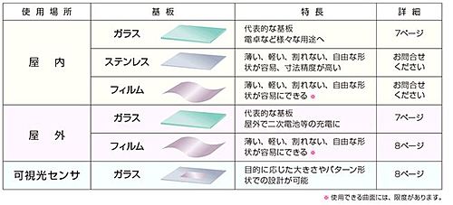 ●機器の駆動に適した電圧に容易に対応 結晶シリコン系太陽電池のように複数個の太陽電池セルを銅線で各々つなぐ作り方とは異なり、太陽電池セルの形成時に複数個のセルを直列に接続する集積型構造です。そのため機器の駆動に適した電圧の製品を作ることができます。 ●様々な形状・形態 代表的なガラス以外にもステンレスやプラスチックフィルムを基板として、割れない、曲げられる、軽い太陽電池を作ることもできます。 四角形に限らず、円形や曲線を含む複雑な形状も可能です。 更にガラス基板を用いたものでは、製品の一部を透明にすることで開口部として様々な用途に用いることができます。 ●可視光領域で高感度 人の眼で感じることのできる波長は、約400~700nmの光です。アモルファスシリコン太陽電池は、ほぼこの波長の光に感度を持っているため、太陽電池だけではなく、可視光センサとしても使用可能です。