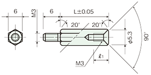 ●材質:快削黄銅(C3604BD)カドミウム含有量75ppm未満●処理:脱脂 ●ネジ径 M=3 ピッチ 0.5●メネジ取付長さ=6●L=17.5