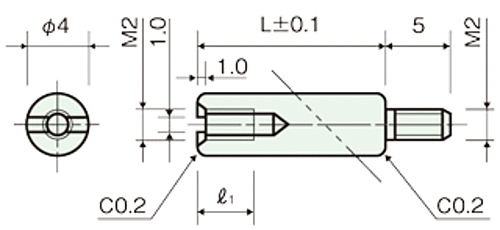 ●材質:快削黄銅(C3604BD)カドミウム含有量75ppm未満●処理:ニッケルメッキ(Ni)●ネジ径 M=2 ピッチ 0.4 スリ割付●メネジ取付長さ=5●L=16.5