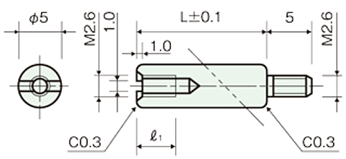 ●材質:快削黄銅(C3604BD)カドミウム含有量75ppm未満●処理:ニッケルメッキ(Ni)●ネジ径 M=2.6 ピッチ 0.45 スリ割付●メネジ取付長さ=5●L=26