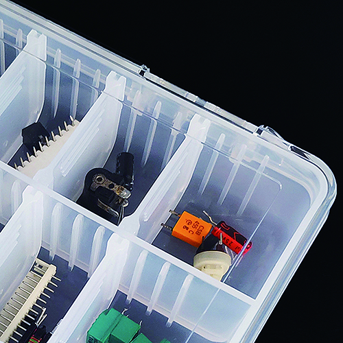 【特長】●軽量で耐久性に優れたパーツケース。●蓋は強度に優れたポリカーボネート。透明度が高く収納物の確認ができます。●仕切板は収納物の大きさに合わせて、3.2mmの刻みで細かく仕切りを調整できます。【用途】●電子部品などの収納、持ち運びに。【仕様】●外寸:255×190×40mm●内寸:245×40(×4)×35mm●重量:400g●付属品:仕切板(32枚)●材質:本体&仕切板/ポリプロピレン、蓋/ポリカーボネート※写真はイメージです。※在庫切れの場合は別途御相談させて頂きます。※RoHS証明は間接材としての使用に限ります。(証明対象は製品又は部品のみで包装材・ケース等は含みません)※RoHS対応状況:製品ごとに異なりますのでメーカーホームページより御確認ください。