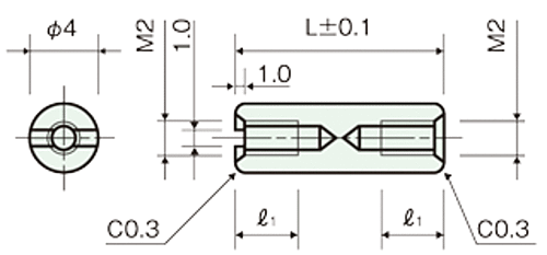 ●材質:鉛レス快削アルミ(CB156) 鉛含有量10ppm以下●処理:黒アルマイト(BAL)●ネジ径 M=2 ピッチ 0.4 スリ割付●メネジ取付長さ=5●L=30