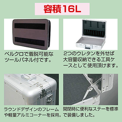 【特長】●2種類のウレタンで収納物をしっかり守るアルミトランク。●本体側、蓋側の2種類の軟質ウレタンが収納物を衝撃から保護します。●本体側の切れ目入り軟質ウレタンは15mm角の切れ目があり、収納物に合わせて抜き形状を作成できます。●ウレタンを外すことで、大容量のツールケースとして使用できます。●着脱可能なツールパネル付き。●内装はメルトン仕上げ。●開閉時に便利なステーを標準装備。●ショルダーベルト付きで、持ち運びに便利。【用途】●各種工具、カメラ、ビデオ、精密機器の収納、持ち運びに。【仕様】●外寸:450×330×135mm●内寸:435×315×120mm●工具パネルサイズ:420×300mm●切り目入り軟質ウレタンサイズ:435×315×65mm●波型軟質ウレタンサイズ:435×315×45mm●重量:4.1kg●色:シルバー●付属品:ショルダーベルト、カギ(2個)※写真はイメージです。※在庫切れの場合は別途御相談させて頂きます。※RoHS証明は間接材としての使用に限ります。(証明対象は製品又は部品のみで包装材・ケース等は含みません)※RoHS対応状況:製品ごとに異なりますのでメーカーホームページより御確認ください。