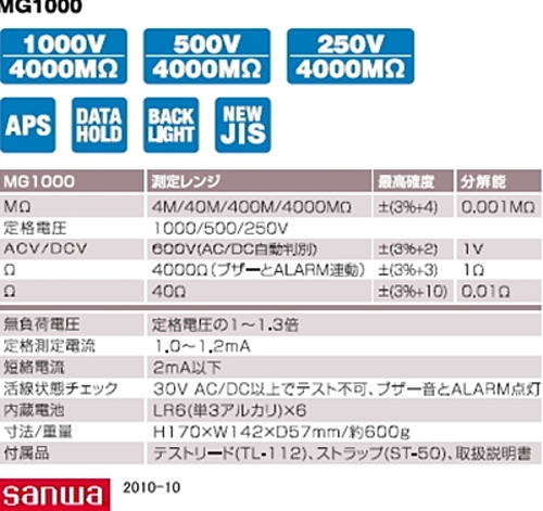 【主な仕様】 MΩ(定格電圧):4000MΩ(250V/500V/1000V) ACV/DCV:600V(AC/DC自動判別) Ω(導通):4000Ω Ω:40Ω 定格電流:1.0~1.2mA 活線状態チェック:30V AC/DC以上でテスト不可、ブザーとアラーム点灯でお知らせ 電源:LR6(単3形アルカリ乾電池)×6 寸法/質量:H170*W142*D57mm/約600g 付属品:テストリード(赤ピン、黒ワニ口)、ストラップ 【オプションアクセサリ(別売り)】 ・クリップアダプタ : CL-16