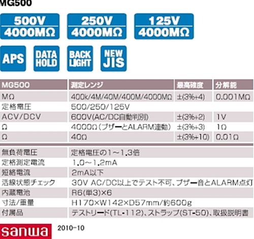 【主な仕様】 MΩ(定格電圧):4000MΩ(125V/250V/500V) ACV/DCV:600V(AC/DC自動判別) Ω(導通):4000Ω Ω:40Ω 定格電流:1.0~1.2mA 活線状態チェック:30V AC/DC以上でテスト不可、ブザーとアラーム点灯でお知らせ 電源:R6P(単3形乾電池)×6 寸法/質量:H170*W142*D57mm/約600g 付属品:テストリード(赤ピン、黒ワニ口)、ストラップ 【オプションアクセサリ(別売り)】 ・クリップアダプタ : CL-16 ・テストリード : TLF-120