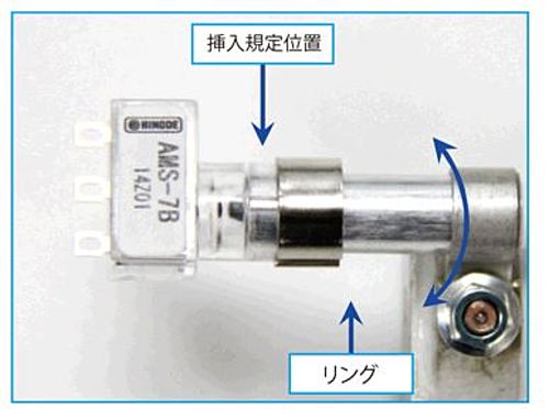 マイクロスイッチは軽く左右に振り回しながら規定位置まで装着してください。 警報ヒューズを無理入れ(斜め挿入など)すると、「警報ヒューズが本体から抜ける」 「警報バンドが変形する]場合があります。 また、規定位置まで挿入しないと溶断棒がスイッチを押さない場合があります。 ※警報ヒューズ抜け防止のため、マイクロスイッチ挿入部にリングがあります。 リング寸法値によっては、多少挿入力が高い場合がありますが、上記に注意しそのままご使用ください。