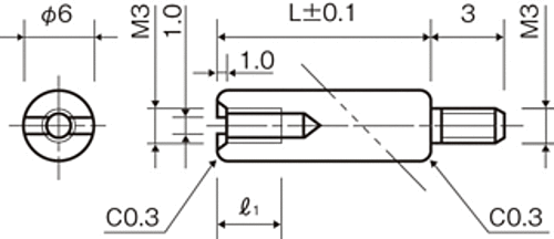 ●材質:快削黄銅(C3604BD)カドミウム含有量75ppm未満 ●処理:ニッケルメッキ(Ni) ●ネジ径(ピッチ):M3(0.5)●スリ割付●オネジの長さ:3mm●メネジ取り付け長さ:6●L:17