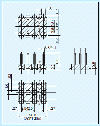 表面実装用基板に立てられるラッピング端子です。2.54㎜ピッチで3列連結しています。(最大20PT連結)3回路用ジャンプソケット(3JS-1)を抜き差しすることによってスイッチの代用となります。両サイド位置決めピン無しタイプ。リフロー対応型。材質・SMTピン部 黄銅・樹脂部 PPS黒色(UL94V-0)処理HWT-20PT-G ニッケル下地金メッキHWT-20PT-S ニッケル下地スズメッキ仕様・定格電流 3A・絶縁抵抗 500MΩ以上・絶縁耐圧 1000V AC、DC 1分間・使用温度範囲 -40~+125℃※写真はイメージです。※在庫切れの場合は別途御相談させて頂きます。