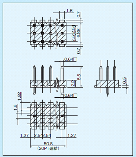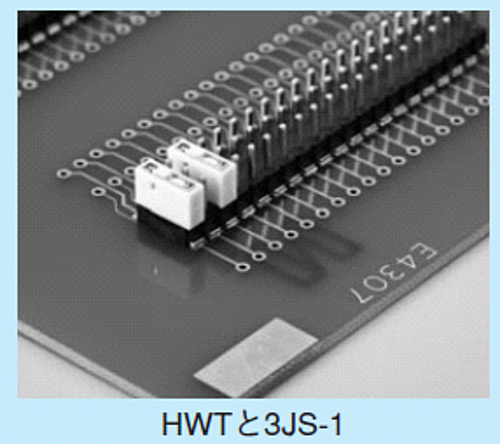 表面実装用基板に立てられるラッピング端子です。2.54㎜ピッチで3列連結しています。(最大20PT連結)3回路用ジャンプソケット(3JS-1)を抜き差しすることによってスイッチの代用となります。両サイド位置決めピン付タイプ。リフロー対応型。材質・SMTピン部 黄銅・位置決めピン部 リン青銅・樹脂部 PPS黒色(UL94V-0)処理HWT-20PT-G ニッケル下地金メッキHWT-20PT-S ニッケル下地スズメッキ仕様・定格電流 3A・絶縁抵抗 500MΩ以上・絶縁耐圧 1000V AC、DC 1分間・使用温度範囲 -40~+125℃※写真はイメージです。※在庫切れの場合は別途御相談させて頂きます。