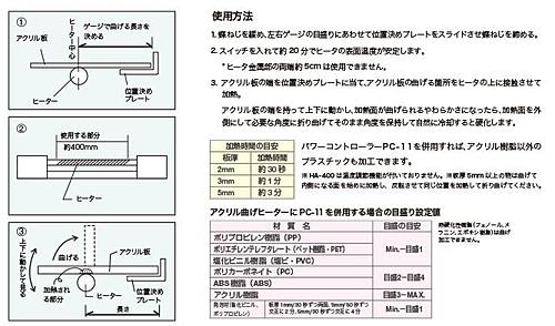 アクリル板をむらなく加工してきれいに曲げることができます。 位置決めプレートとゲージ付でアクリル板の保持、折り曲げ位置決めが容易にできます。 アクリル板の曲げ加工専用ヒーターです。 仕様 ・質量 2kg ・サーモスタット なし ・幅(mm) 640 ・電源コード長さ 1.5m ・ゲージ設定寸法 70~450mm ・最大折り曲げ幅 400mm ・電源(V) AC100 ・消費電力(W) 65 ・最高温度(℃) 220 ※サイズはゲージ・位置決めプレート、質量はコードを除く。 ※写真はイメージです。 ※在庫切れの場合は別途御相談させて頂きます。 ※RoHS対応状況:製品ごとに異なりますのでメーカーホームページより御確認ください。