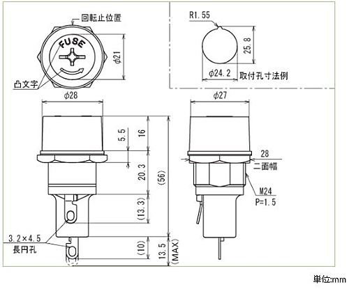 ■定格:250V-30A ■絶縁抵抗:DC500V、100MΩ以上 ■耐電圧:AC2000V(1分間) ■主絶縁材(本体):フェノール(UL94V-0) ■主絶縁材(ツマミ):P.B.T.(UL94V-0) ■端子金具:はんだ付け用端子 ■本体色:B(黒) ■取付板厚:6.0mm(MAX) ■ナット締付けトルク:2.0N・m以下 ■ナット二面幅:28mm ■推奨適合工具:プラスまたはマイナスドライバー ■使用上の注意: ①底部端子は可動式のため、束線等により端子の動きを妨げないようにしてください。また、配線後、端子にリード線の張力等が加わらないように周囲の配線等にご注意ください。 ※写真はイメージです。 ※在庫切れの場合は別途御相談させて頂きます。