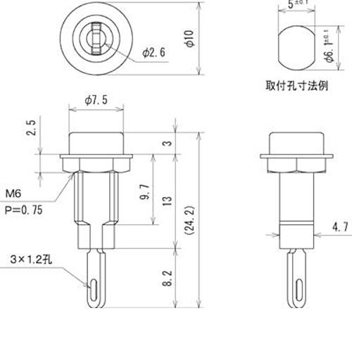 ■定格5A■耐電圧AC1000V(1分間) ■絶縁抵抗DC500V、100MΩ以上 ■パネル取付方式ナット締め付け ■ナット締付けトルク0.1N・m以下 ■ナット二面幅8.0mm ■主絶縁材ナイロン6 ■本体色B(黒) ■適合商品TJ-2-P ■RoHS対応