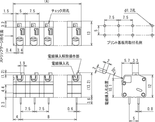 ●定格:300V-10A ●絶縁抵抗:DC500V、100MΩ以上 ●耐電圧:AC2000V(1分間) ●取得規格:UL規格・CSA規格・TÜV規格(IEC60947-7-1に適合) ●極数(P):2~20 ●チェック孔:有り ●主絶縁材(本体):ナイロン66(UL94V-0) ●主絶縁材(ボタン):P.P.E.(UL94V-0) ●定格適合電線:単線φ1.2mm(AWG16) ●使用可能電線範囲:単線φ0.65mm~φ1.6mm(AWG22~AWG14) ●端子金具:PC端子 ●標準剥き線長:9~10mm ●本体色:GY(グレー) ●エンドプレート色:GY (グレー) ●操作部色:W (白) ●推奨適合工具:マイナスドライバー(軸径φ3mm、刃先幅2.6mm) ■使用上の注意 ①丸洗い洗浄はボタンに悪影響が考えられますので、お避けください。 ②規格品としてご使用の場合は、規格上の制約等をご確認ください。 ※在庫がある場合がございますので、お問合せください。