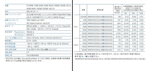 □基本特性/定格 容量:4GB (pSLC) 動作周囲温度:-40 to +85℃ 保存温度:-40 to +85℃ □特徴 1. 自社開発、SDコントローラGBDriver RD4搭載。 2. 国産 4K、8KByte/Page(SLC)、16KByte/Page(pSLC)NAND型フラッシュメモリ搭載。 3. SD Specification ver.3.01対応。 SDHC(4GB~):UHS-I/SDスピードクラス Class10 対応。 SD(~2GB):SDスピードクラス Class6 対応。 4. 42bit/1KByte ECC搭載(4GB~)。24bit/1KByte ECC搭載(~2GB)。 5. TDK Global Staticウェアラベリング機能搭載。 6. データランダマイザ機能+オートリフレッシュ機能(起動時+24時間毎)搭載。 7. リードリトライ機能搭載。 8. 寿命診断ソフトTDK SMART付属。 9. 全セクタ数設定機能(クリッピング機能含む)搭載。 10. SDA準拠セキュリティー/TDKオリジナルセキュリティ機能搭載。 11. 専任FAEによる技術サポート対応。 12. RoHS指令対応。 □フラッシュストレージ総合カタログ https://product.tdk.com/system/files/dam/doc/content/flash-storage/ja/flashstorage-catalog_ja_01.pdf □用途 ドライブレコーダー 監視カメラ 計測器、データーロガー POS端末 医療機器(血圧計、画像診断装置)