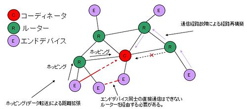 ■ ネットワーク構成 ZigBeeにはコーディネータ、ルータ、エンドデバイスの3種類の役割がありメッシュ構成をとります。 コーディネータの機能 ネットワークに1つだけ存在します。基本的には他ノードのデータはコーディネータに集めます。スリープ機能がありません。 ルータの機能 データの中継を行います。スリープ機能がありません。 エンドデバイスの機能 スリープ機能があり低消費電力で動作できます。エンドデバイスにセンサーや制御するための装置などつけて使用します。