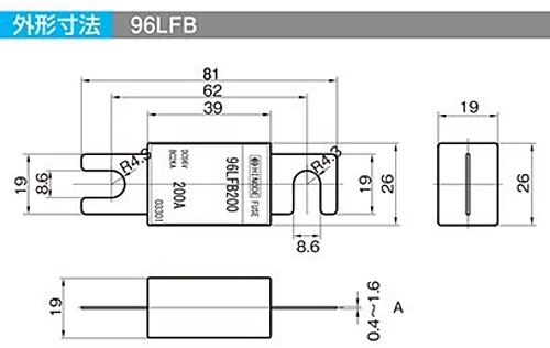 ●定格電圧(V):DC96 ●定格電流(A):225 ●端子 A寸法(mm):1.2 ●質量(g):55 ●電動フォークリフト等に最適 ※写真はイメージです。