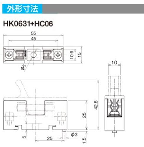 ●定格電圧:500V ●定格電流:15A ●適合電線:最大5.5mm²(M4) ●取り付け:DINレールおよび直付け ●材質:PBT