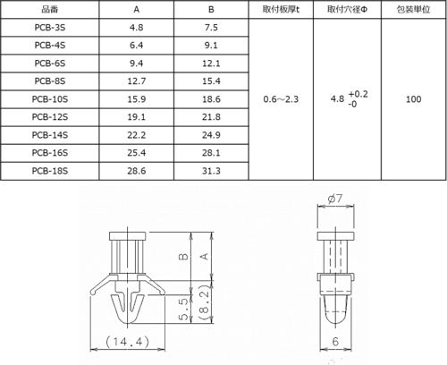 プリント基板アクセサリー 優れた耐衝撃性、耐熱性、電気絶縁性及び耐薬品性 装着状態を十分に考慮した当社独自の設計によるせん断に強い形状 シャーシにプリント基板をワンタッチで固定 材質:66ナイロン 難燃性UL94V-0