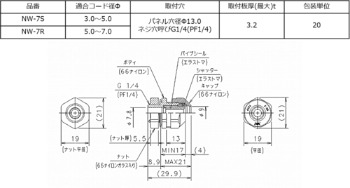 ケーブルグランド 優れた耐衝撃性、耐熱性、電気絶縁性及び耐薬品性(塗装仕様にも最適) 用途によって使い分けられる14タイプ 各種の太さのコードを水、油等から完全に遮断 優れた密封性、締付力 機器の高密度実装に最適