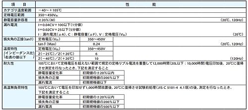 ●薄形電源用途向けにラインアップ。 ●KXLシリーズを小形化。 ●定格電圧範囲:350~450V、静電容量範囲:15~330μF。 ●105℃ 10000~12000時間保証(リプル重畳)。 ●基板洗浄タイプではありませんのでご注意下さい。 温度範囲[℃]:-40 ~ 105 定格電圧[Vdc]:450 静電容量[μF]:180 寸法?D(L)[mm]:18 寸法L(W)[mm]:40 定格リプル電流[mArms]:1160(105℃/120Hz) 耐久性[hrs]:12000(105℃/DC+リプル) ※写真はイメージです。