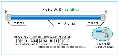 【特長】1.高周波特性 セミリジッドケーブル(SP-22)と同等の挿入損失、並びにVSWR 曲げなどに対する高い位相安定性をもちます2.フレキシブル性 柔軟性と同時に形状安定性を備えています (柔軟性:R40mmでの360度屈曲試験、500回以上)3.軽量 SMA/P両端付きケーブルアッセンブリ1m:42g4.短納期対応 標準納期:3W以内(お問い合わせ下さい) 但し、在庫状況により即納も可5.経済性 ケーブル、コネクタ共に弊社内製品です 抜群のコストパフォーマンスをご提供いたしますコネクタA:SMA/PコネクタB:SMA/P