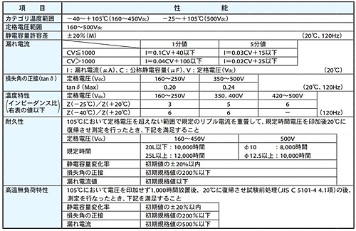 ● 定格電圧範囲:160~500V、静電容量範囲:6.8~680μF。