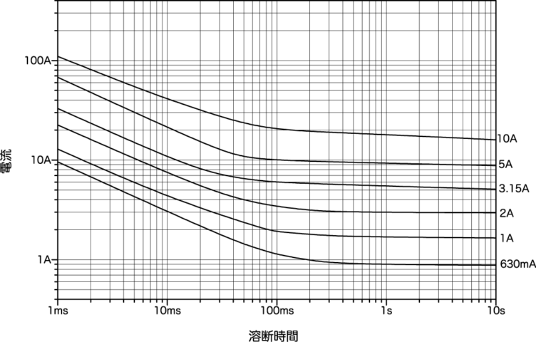 当社が試験条件を特定して測定した実測値の平均値をプロットしておりますので、保証値ではありません。ヒューズの特性は使用条件によって変化しますので、貴社のご使用条件下で、ヒューズが貴社のご要求を満足しているかを実際にご確認頂く必要があります。